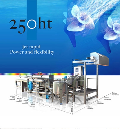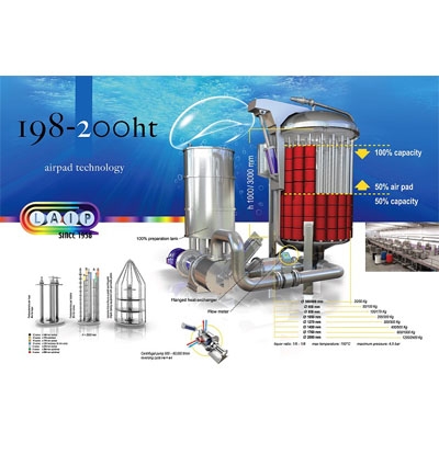 The machines are tested and approved to function at a maximum temperature of 150 °C - 4,5 bar pressure - with air cushion (external bath recycling available on request) at liquor ratios from 1/3 to 1/9. Water consumption is limited thanks to the air cushion that ensures the same liquor ratio for partial loads as for full capacity loads. The oversized centrifuge propulsor unit has pneumatically operated bath cycle invertor. The machine is a compact vertical cylinder entirely constructed in AISI 316 stainless steel. High quality output with minimum labour cost is ensured by optimal energy consumption as well as perfectly reproducible cycles thanks to the process automation system and the accurate control and reprogramming of such variable parameters as capacity, bath volume and pH factor.